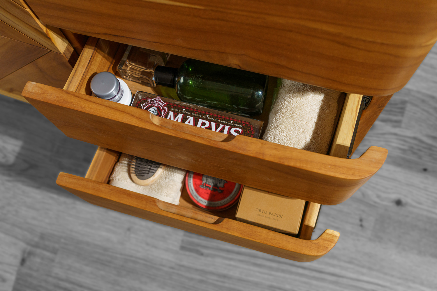 Lo spazio così prezioso nella Sala da Bagno trova un altrettanto prezioso protagonista in questo Consolle in teak.Il legno viene lievemente trattato con cere protettive e mantiene il tono caldo ed irripetibile delle essenze tropicali più pregiate.
