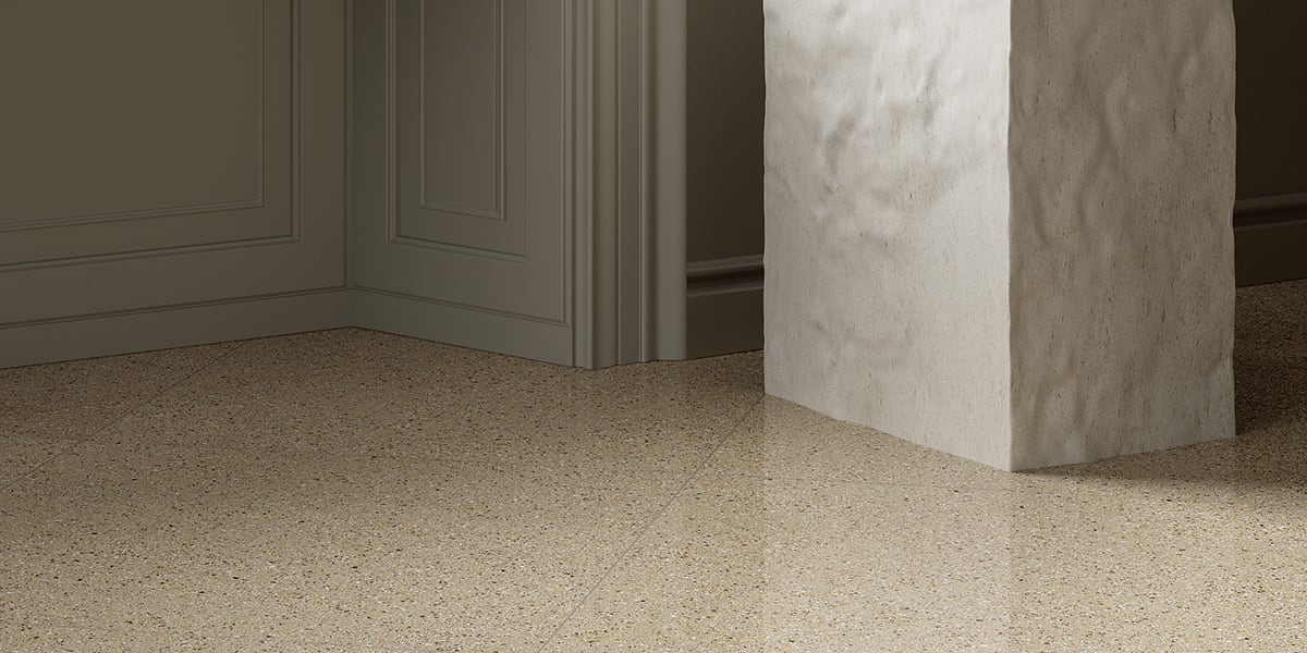 La base del tessuto ceramico si fa impalpabile, quasi perlacea: è una scenografia perfetta per lasciare in risalto pigmenti scuri che, come in un quadro impressionista, si accostano ad altri senza mai mescolarsi. Fanno capolino dettagli rosei e screziature biancastre, ricordo dell’identità nobile e romantica del terrazzo.