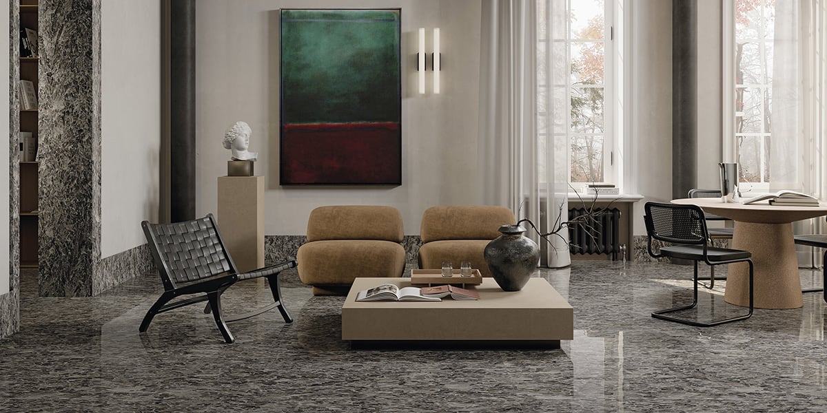Le collezioni, disponibili anche in grandi lastre sottili, garantiscono resistenza, eleganza e versatilità per pavimenti, rivestimenti e arredi.