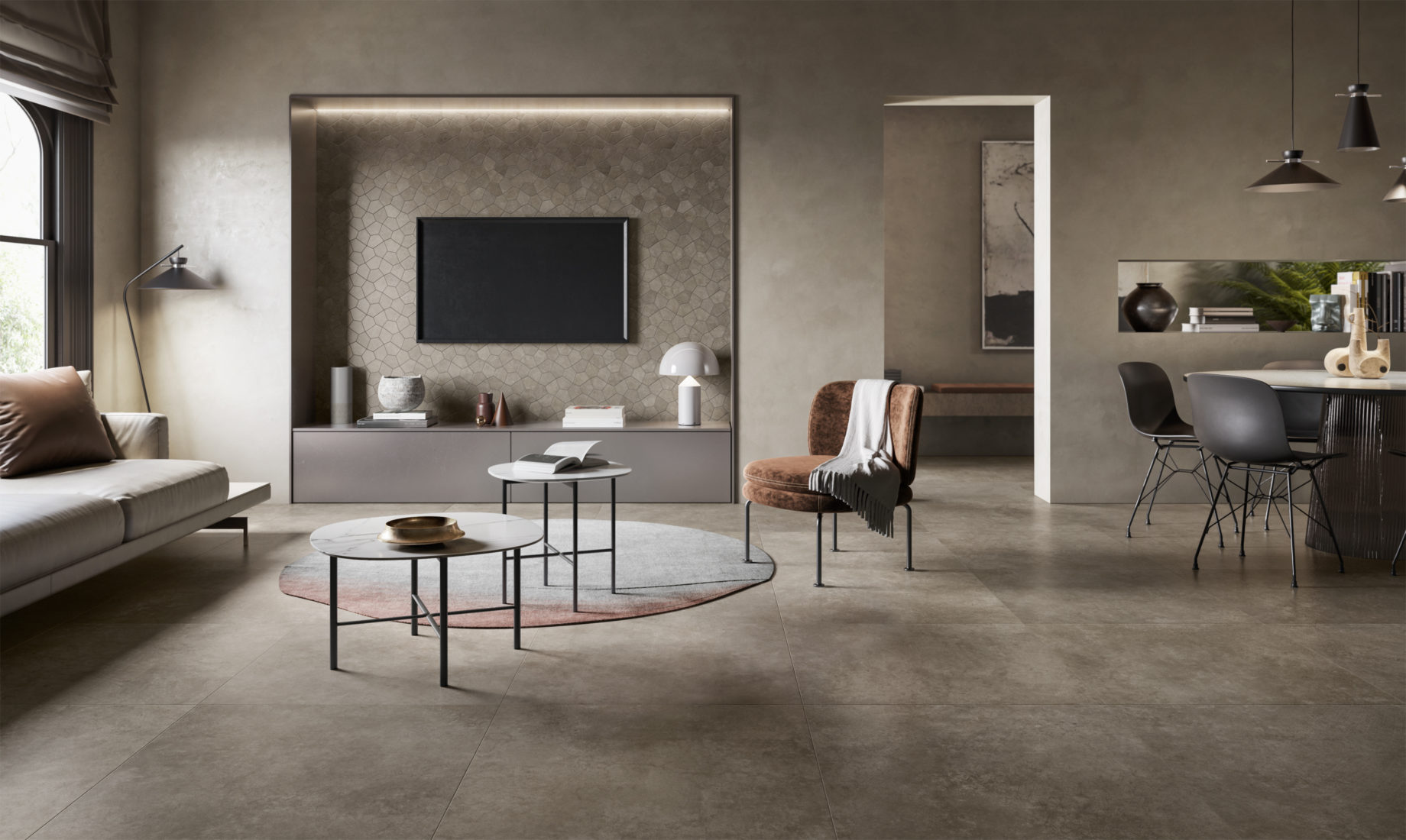 Esprit riveste gli interni contemporanei con superfici in gres porcellanato che reinterpretano l'estetica industriale. Queste superfici offrono un nuovo approccio all'estetica moderna, combinando robustezza e stile.