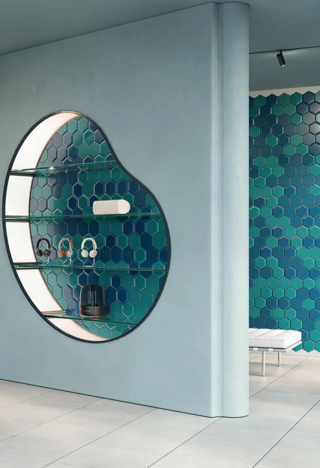 Collezione di piastrelle da rivestimento d’interni, realizzata in monoporosa in pasta bianca, composta da sei colori lucidi declinati nelle strutture – 15x17 cm liscio spessore 8,5 mm e 15x17 cm diamantato spessore 12 mm.