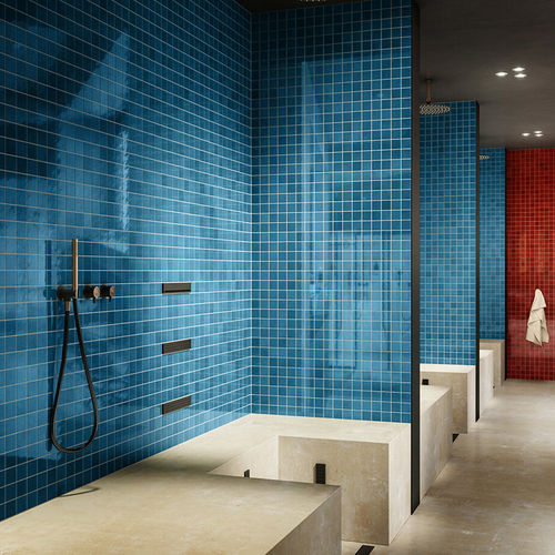 La superficie, leggermente mossa e lucida, risulta estremamente sensibile ad ogni fonte luminosa, assumendo riflessi e nuance di colore diversi ad ogni variazione di luce. Il forte effetto stonalizzato viene ulteriormente accentuato dalla posa random delle piastrelle sia nel formato 5x5 cm che 10x10 cm, montate su rete, diventando reale elemento di arredo per ambienti residenziali ed extra residenziali ed evocando una dimensione intima e domestica.