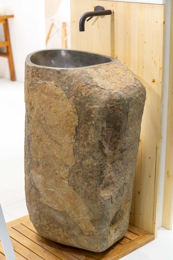 Lavandino free standing in pietra di fiume scavata a mano. Apertura posteriore per collegamenti idraulici. Ogni pezzo è unico, servizio di selezione fotografica all’ordine.
