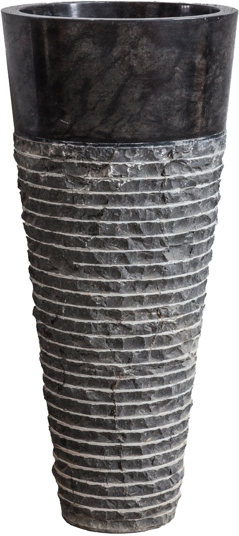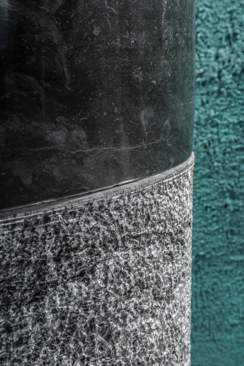 Lavandino free standing in marmo. Vasca lavabo levigata, base in marmo grezzo lavorato a selcio. Predisposto per collegamenti idraulici. Ogni pezzo è unico.