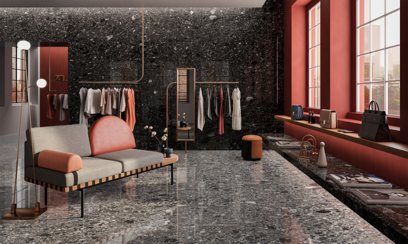 Chiaroscuro interpreta il gres porcellanato con una pietra di origine calcarea tipica dell'Italia settentrionale. Questo materiale, utilizzato da secoli in architettura, viene attualizzato con uno stile contemporaneo.